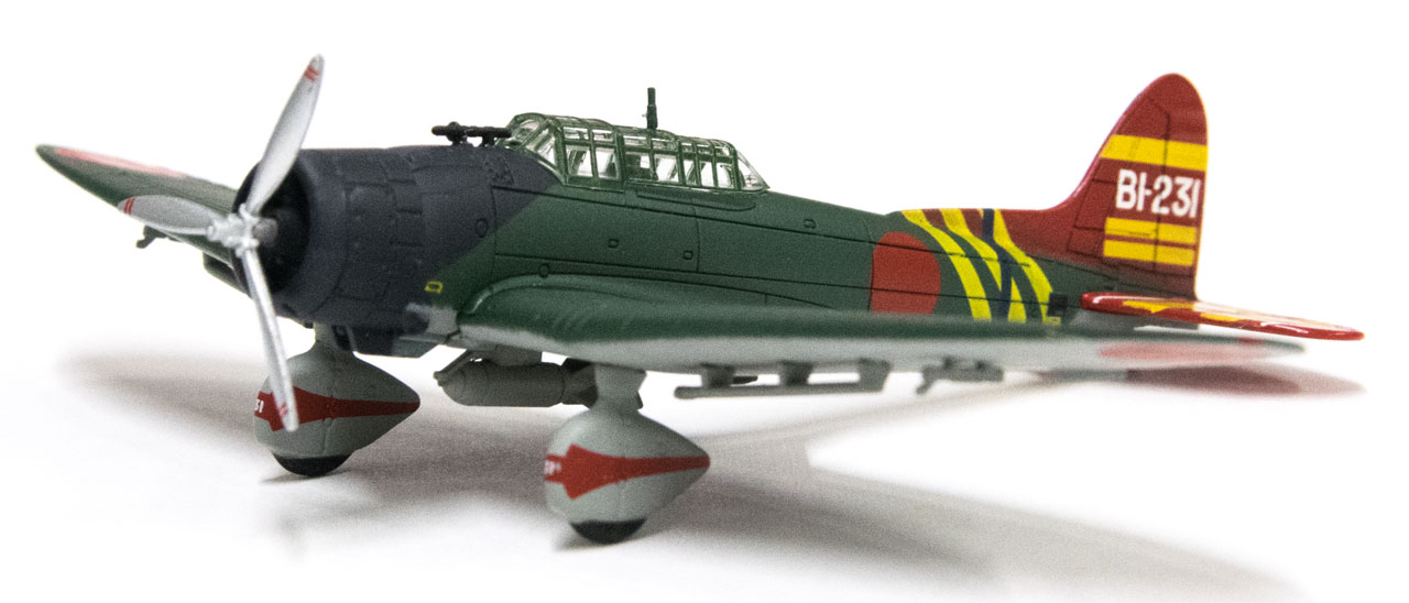 スケール1/144で全長7cm程というコンパクトな本体サイズながら、細部のディティールまでこだわった完成品ダイキャストモデル。モデルとなったのは、空母蒼龍艦載機、愛知航空機製造の九九式艦上爆撃機。艦上爆撃機の神様と呼ばれた江草隆繁氏の搭乗機で、派手なカラーリングが特長の”BI-231”を再現。