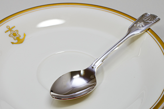 セットでお届けするティースプーンは燕物産(当時:捧吉右衛門商店)によるもの。横須賀・呉の海軍軍需部にカトラリーを納入していました。中でも、接待用として用いられた高級品「紅茶匙」を、この度、復刻していただきました。